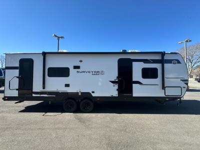 Value and versatility go hand-in-hand with the Surveyor Camp Series travel trailers by Forest River. The solid construction includes a 2" aluminum framed floor with block foam insulation and a sealed underbelly with forced heat and radiant foil insulation. A 100-watt roof mounted solar panel will provide some off-grid power, and the power tongue jack will let you easily hitch up and go whenever you're ready. Additional stand-out features include Surf(X) seamless countertops throughout, two A/C units, an electric awning with LED light strip, black glass friction hinge entry door(s), and so much more!