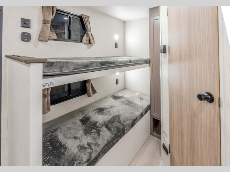 Sleeps 8 Length 27 ft 7 in Ext Width 7 ft 6 in Ext Height 9 ft 4 in Int Height 6 ft 6 in Interior Color Nomad, Mushroom Grey Hitch Weight 440 lbs GVWR 5600 lbs Dry Weight 4120 lbs Cargo Capacity 1480 lbs Fresh Water Capacity 36 gals Grey Water Capacity 26 gals Black Water Capacity 26 gals Tire Size 15" Furnace BTU 20000 btu Number Of Bunks 2 Available Beds Queen Refrigerator Type 12V Refrigerator Size 8 cu ft Cooktop Burners 2 Number of Awnings 1 Axle Weight 3680 lbs LP Tank Capacity 20 lbs Water Heater Type Tankless AC BTU 15000 btu Awning Info 14' Power Axle Count 1 Number of LP Tanks 1 Shower Type Neo-Angled Similar Floorplans